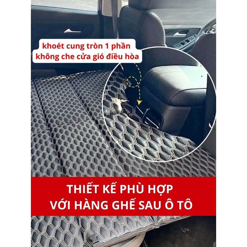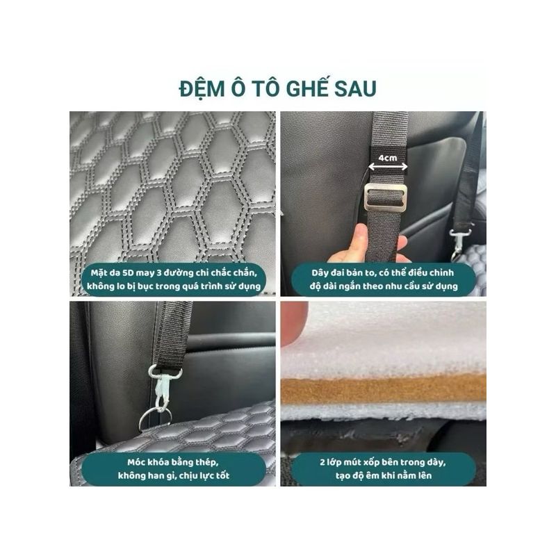 Biến ghế sau thành giường; mặt phẳng rộng rãi để ngồi chơi, nghỉ ngơi Thiết kế 2 mặt sạch sẽ, nhẹ thoáng, dễ dàng vệ sinh Chịu tải lên đến 300KG - Tương thích dòng xe từ 5 đến 7 chỗ Chất liệu da 5D cao cấp, SIÊU BỀN, SIÊU ÊM Mở, gấp nhanh gọn treo lưng ghế hoặc cất cốp xe ĐA NĂNG có thể mang đi nhiều nơi Màu đen họa tiết oval sang trọng