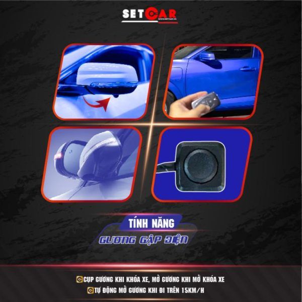 - Module tích hợp chức năng khóa và mở cửa: Đồng bộ với chìa khóa của xe, tự động gập gương khi khóa xe và mở gương khi mở khóa.