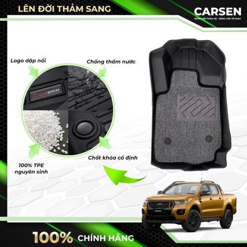 - Thảm sàn Ford Ranger 2017-2021 làm từ nhựa TPE có khả năng chống thấm nước, chịu nhiệt cao, cách âm và giảm tiếng ồn rất tốt.