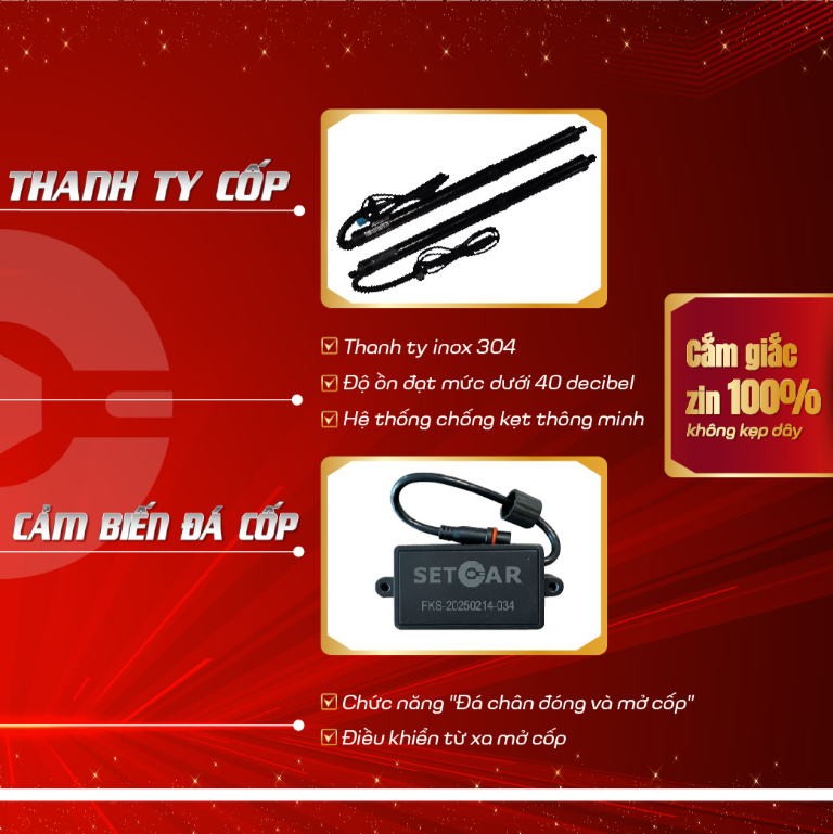 - 2 Ty thủy lực: Chắc chắn và bền bỉ, hỗ trợ đóng/mở cốp một cách nhẹ nhàng và êm ái. Độ ồn dưới 40 decibel.